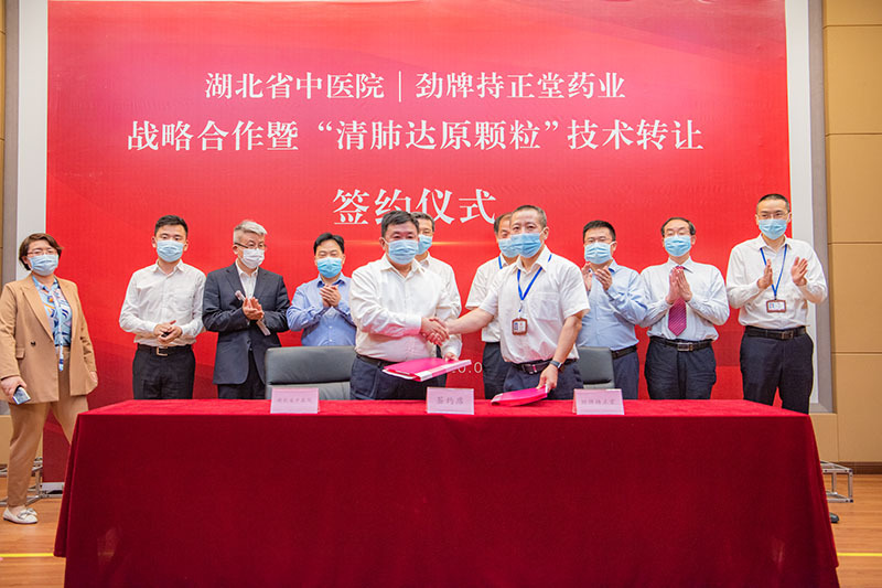 5月11日,湖北省中醫(yī)院與勁牌持正堂藥業(yè)戰(zhàn)略合作暨“清肺達(dá)原顆?!奔夹g(shù)轉(zhuǎn)讓簽約儀式,在勁牌持正堂藥業(yè)隆重舉行。湖北省中醫(yī)院黨委書記巴元明、院長何紹斌,黃石市衛(wèi)健委主任劉安定,勁牌公司董事長、總裁吳少勛,勁牌持正堂藥業(yè)總經(jīng)理李清安出席儀式。 來訪領(lǐng)導(dǎo)先后參觀了勁牌研究院、中藥提取車間,了解了公司數(shù)字提取工藝,和疫情期間中藥產(chǎn)品的生產(chǎn)捐贈(zèng)情況。隨后在持正堂藥業(yè)展開座談會議。 會上,雙方對各自發(fā)展歷程、運(yùn)營狀況、技術(shù)強(qiáng)項(xiàng)及面臨困難進(jìn)行了深入溝通。 巴元明書記以“重大疫情”、“重大擔(dān)當(dāng)”、“重大機(jī)遇”、“重大合作”四個(gè)重大高度概括此次合作及其背景。他表示,在這次傳播速度最快、感染率最廣、防控難度最大的歷史性疫情面前,雙方都展現(xiàn)出了高度的責(zé)任與擔(dān)當(dāng);同時(shí),中醫(yī)藥在本次疫情防控中彰顯的突出效果為中醫(yī)藥產(chǎn)業(yè)的發(fā)展創(chuàng)造了天時(shí)、地利、人和的重要機(jī)遇,期望以此次“清肺達(dá)原顆?!?/strong>臨床批件申報(bào)為起點(diǎn),與勁牌一起傳承精華,守正創(chuàng)新,攜手打造湖北中醫(yī)藥強(qiáng)省。 何紹斌院長表示,此次與勁牌的戰(zhàn)略合作,雙方目標(biāo)一致,互補(bǔ)性強(qiáng),可充分發(fā)揮湖北省中醫(yī)院的科研及臨床優(yōu)勢和勁牌的市場優(yōu)勢。此次合作基礎(chǔ)良好,前景光明。期望雙方加強(qiáng)溝通和交流,共同推進(jìn)戰(zhàn)略合作的深入開展。 會上,湖北省中醫(yī)院院長何紹斌與勁牌有限公司董事長吳少勛,及勁牌持正堂藥業(yè)總經(jīng)理李清安,分別簽訂了“湖北省中醫(yī)院與勁牌持正堂藥業(yè)有限公司共同振興發(fā)展湖北省中醫(yī)藥事業(yè)的戰(zhàn)略合作協(xié)議”和“‘清肺達(dá)原顆?!夹g(shù)轉(zhuǎn)讓與新藥臨床前研究合作協(xié)議”。 據(jù)了解,湖北省中藥資源豐富,中藥工業(yè)存在較大提升空間,湖北省中醫(yī)院作為省內(nèi)龍頭中醫(yī)院,與勁牌達(dá)成戰(zhàn)略合作,包括“積極合作開展茯苓等湖北省優(yōu)勢中藥材的種植、基礎(chǔ)研究及產(chǎn)業(yè)化推廣應(yīng)用”以及“共同推進(jìn)中藥配方顆粒與傳統(tǒng)飲片臨床等效性評價(jià)等工作的開展”,以推動(dòng)湖北省中醫(yī)藥從種植、工業(yè)生產(chǎn)到臨床使用全產(chǎn)業(yè)鏈的發(fā)展,為將湖北打造為中醫(yī)藥強(qiáng)省助力。 清肺達(dá)原顆粒簡介:該方是在國醫(yī)大師梅國強(qiáng)教授的指導(dǎo)下,由巴元明等專家研制的組方(即湖北省中醫(yī)院“肺炎1號”),是唯一一個(gè)用于治療新型冠狀病毒肺炎的湖北省地方組方。已全面應(yīng)用于全省新型冠狀病毒感染肺炎疑似、臨床診斷病例及確診病例治療中。從當(dāng)前的臨床統(tǒng)計(jì)結(jié)果來看,“清肺達(dá)原顆?!迸R床治愈率達(dá)到了95.34%,療效顯著。除治療新型冠狀病毒肺炎之外,該方還可適于由病毒引起的甲流、乙流、禽流感等流行性感冒,具有較大的潛在開發(fā)價(jià)值。
