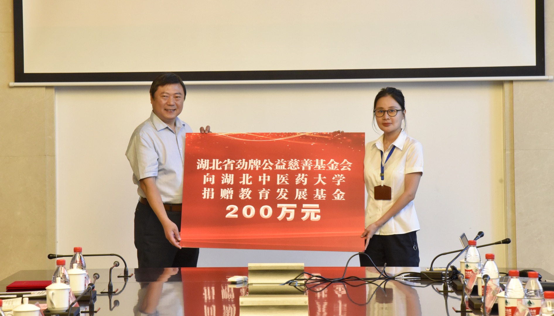 勁牌公益慈善基金會(huì)副理事長(zhǎng)吳曉敏授予湖北中醫(yī)藥大學(xué)辦公室主任汪海洋捐贈(zèng)牌。